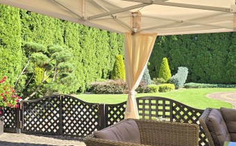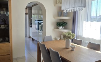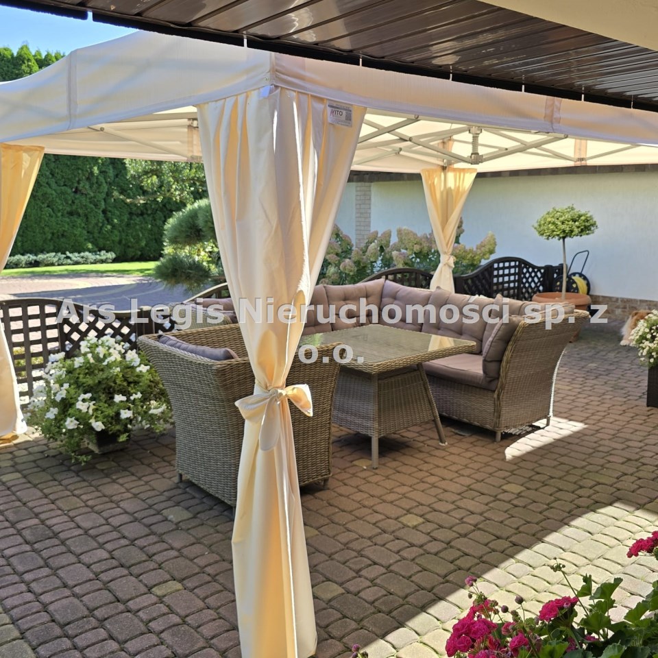 Dom jest w pełni wykończony i umeblowany wg aktualnie obowiązujących trendów, z zachowaniem szczególnej staranności przy wyborze materiałów wykończenia wnętrz. Na podłodze w salonie piękna drewniana podłoga, drzwi wewnętrzne dębowe wykonane na indywidualne zamówienie. Piękna kuchnia w zabudowie wraz ze sprzętami AGD. Dom jest jasny, przestronny z uwzględnieniem wszystkich potrzeb do komfortowego mieszkania. Dom został wybudowany z cegły, ocieplony styropianem o grubości 10 cm, pokryty tynkiem . W domu okna PCV z roletami zewnętrznymi. Dom posiada instalacje fotowoltaiczną o mocy 10 kW oraz instalację solarną do ogrzewania wody. Budynek pokryty gontem bitumicznym. W domu podłączony jest prąd, woda z sieci, kanalizacja oraz światłowód. Dom ogrzewany piecem na gaz z sieci. Dużym atutem jest piękny zadbany ogród z miejscem pod basen oraz duży taras.