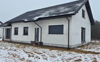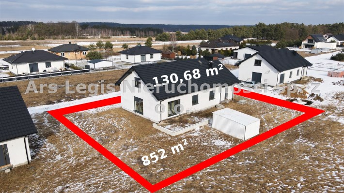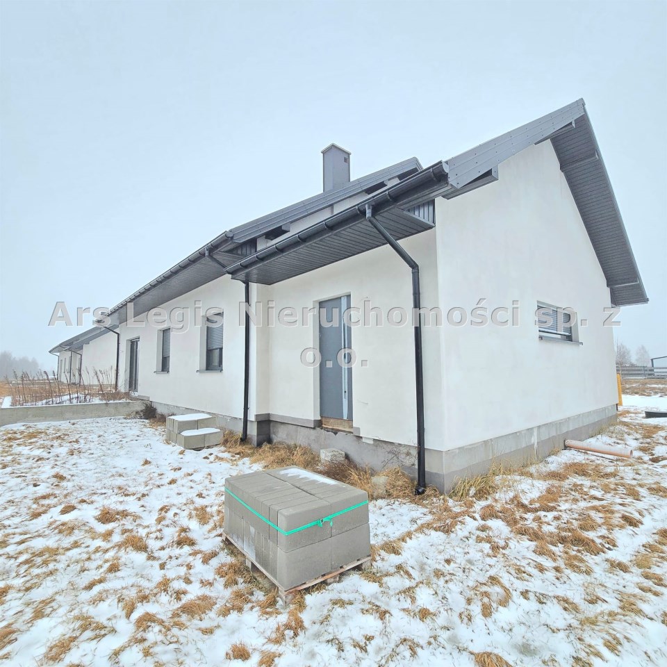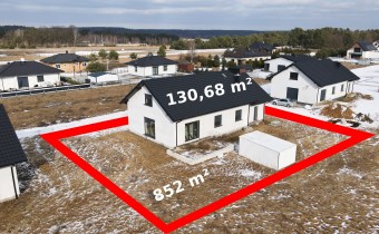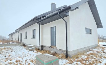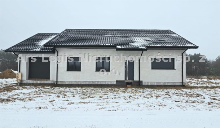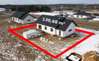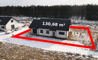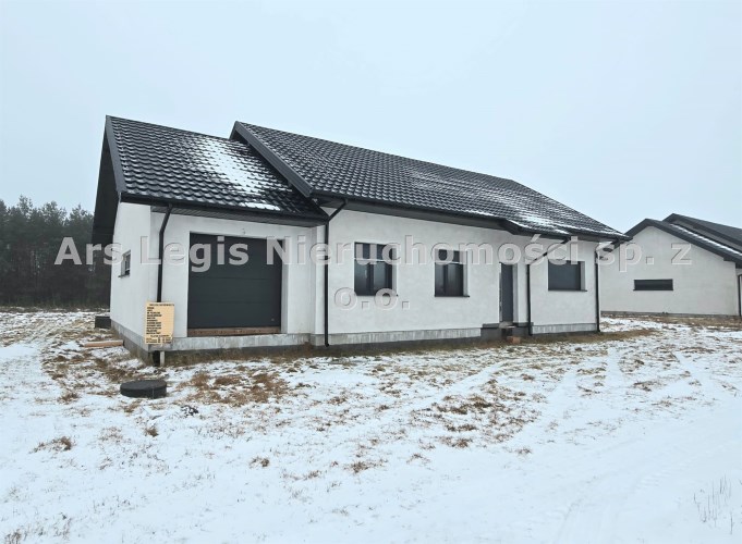 Dom parterowy, wolnostojący, niepodpiwniczony, z garażem w bryle budynku. Dom posiada salon z aneksem kuchennym, 3 pokoje (sypialnie), łazienkę, wc, kotłownię, hall oraz garaż. Łączna powierzchnia użytkowa 130,68㎡. Możliwość adapltacji poddasza na powierzchnie mieszkalną. Wewnątrz budynku rozprowdzona instalacja wodna i kanalizacyjna oraz elektryczna. Wykonano tynki wewnętrzne cementowo-wapienne. Dach wielospadowy pokryty blachodachówką w kolorze antracytowym. Okna PCV 3-szybowe z roletami w kolorystyce dachu. Ściany zewnętrzne ocieplone styropianem o grubości 20 cm. Do działki doprowadzone media-woda i prąd.