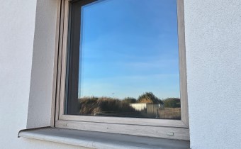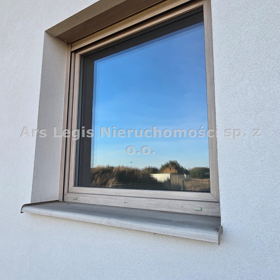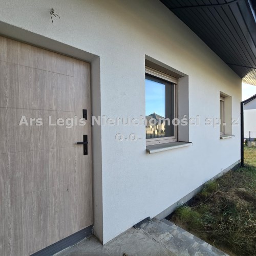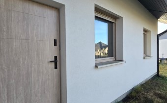 Dach wielospadowy pokryty blachodachówką w kolorze antracytowym. Wykonano podbitkę dachu wraz z systemem rynnowym. Okna PCV 3-szybowe w najmodniejszej aktualnie kolorystyce wraz z roletami zewnętrznymi z elektrycznym sterowaniem. Na zewnątrz zamontowano parapety zewnętrzne spójne z kolorystyką okien. Ściany zewnętrzne ocieplone styropianem grafitowym o grubości 20 cm, a następnie położono tynk ozdobny. Dom wyposażony w drzwi zewnętrzne w kolorystyce okien, do garażu zamontowana została brama garażowa segmentowa z awaryjnym zasilaniem. Na zewnątrz wykonano również podbudowę pod tarasy zewnętrzne. Działka ogrodzona z 3 stron, bez części frontowej.